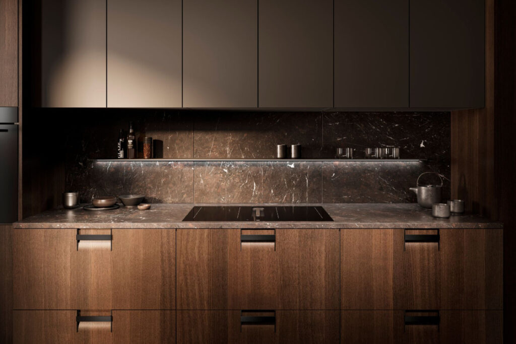 La iluminación también cobra un papel central. Los nuevos sistemas integran luz de manera estratégica para resaltar texturas, mejorar la visibilidad en áreas clave y crear ambientes envolventes. Esta atención al detalle permite que la cocina funcione como un espacio dinámico, tanto de día como de noche.